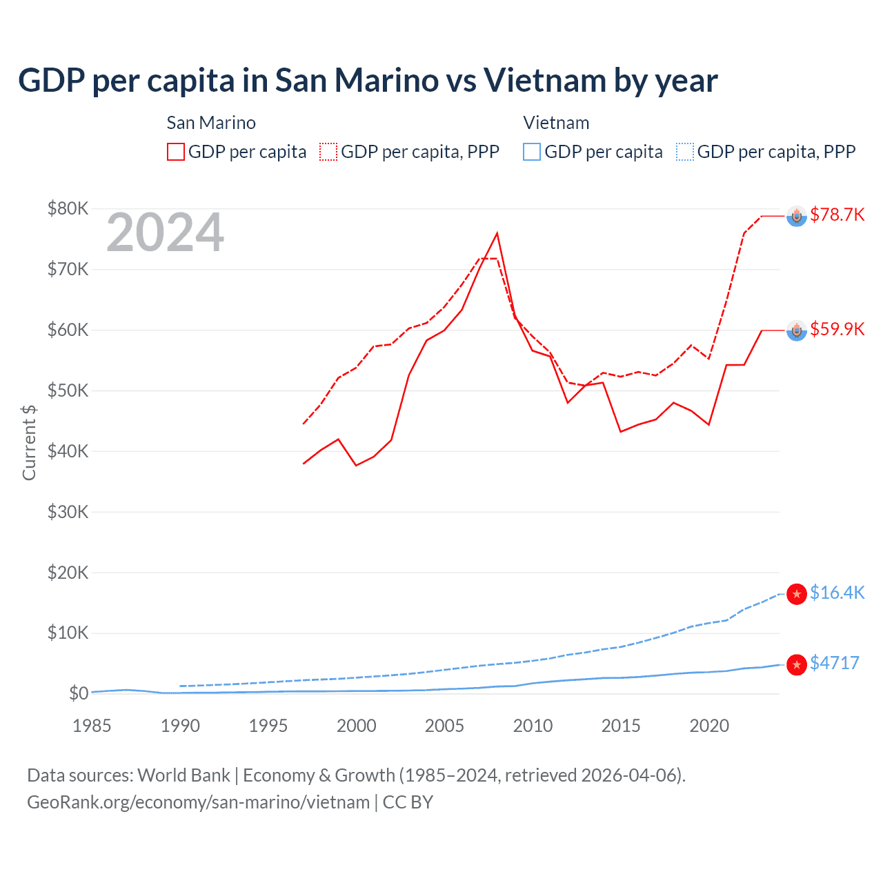 GDP per capita in San Marino vs Vietnam by year
