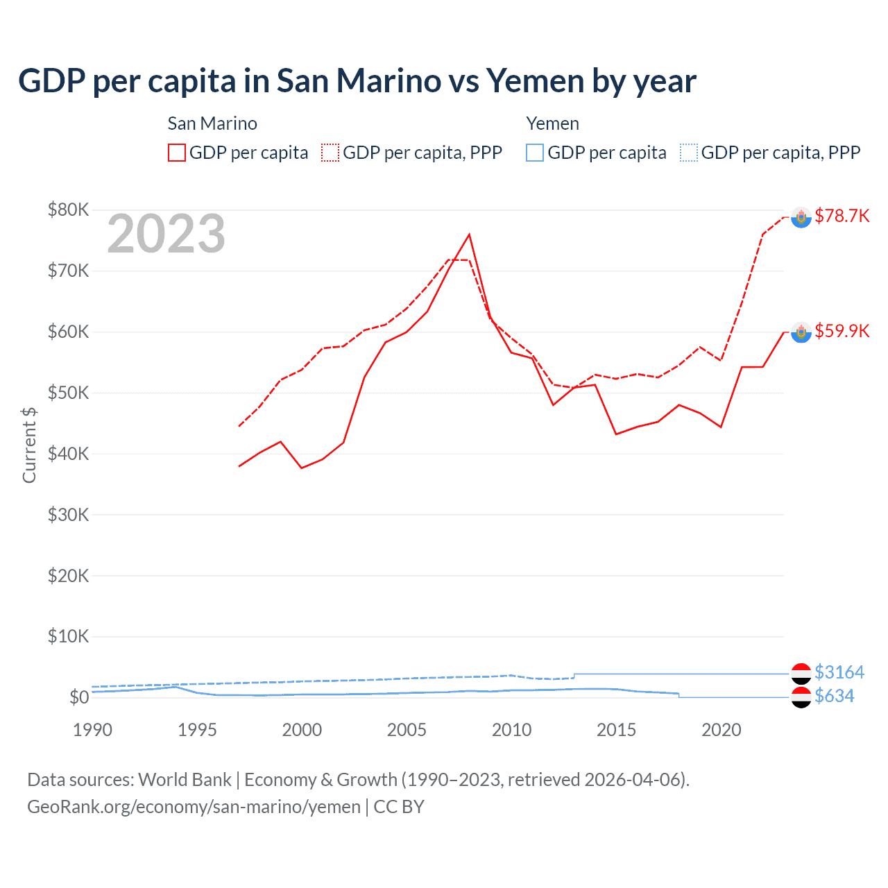 San Marino's GDP per capita is $59,880, ranking 15/197, compared to $634 in Yemen, ranking 191/197. Adjusted for purchasing power (GDP per capita PPP), San Marino ranks 17th at $78,745, while Yemen ranks 178th at $3,164.