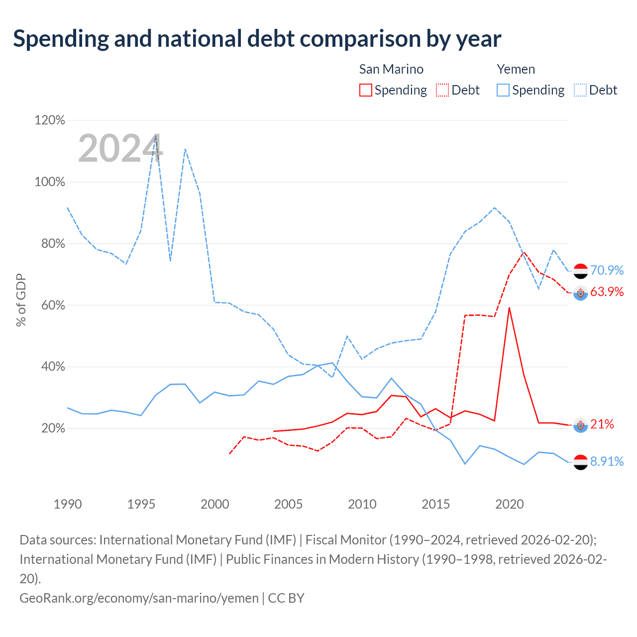 San Marino has $1.39B in government debt (63.9% of GDP), compared to $18.8B (70.9% of GDP) in Yemen.