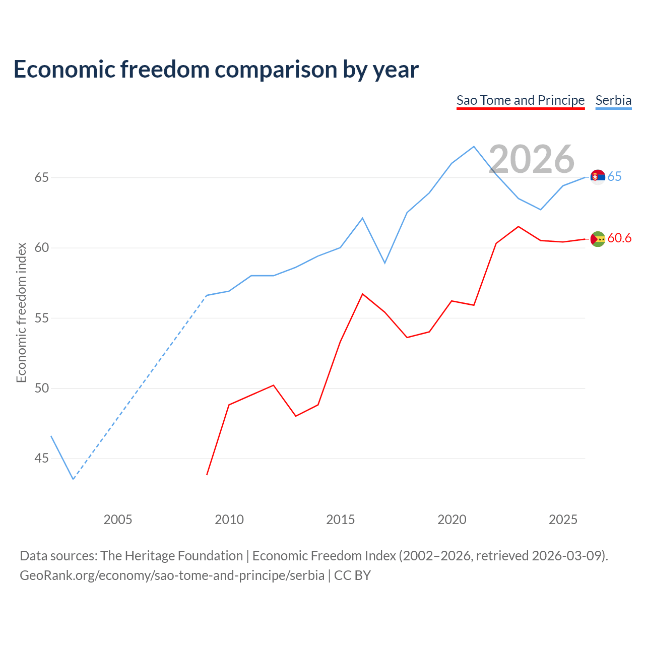 The Economic Freedom Index for Sao Tome and Principe is 60.6, ranking 93/197, compared to 65 for Serbia, ranking 68/197. The chart above displays a comparison of annual changes in economic freedom indexes.