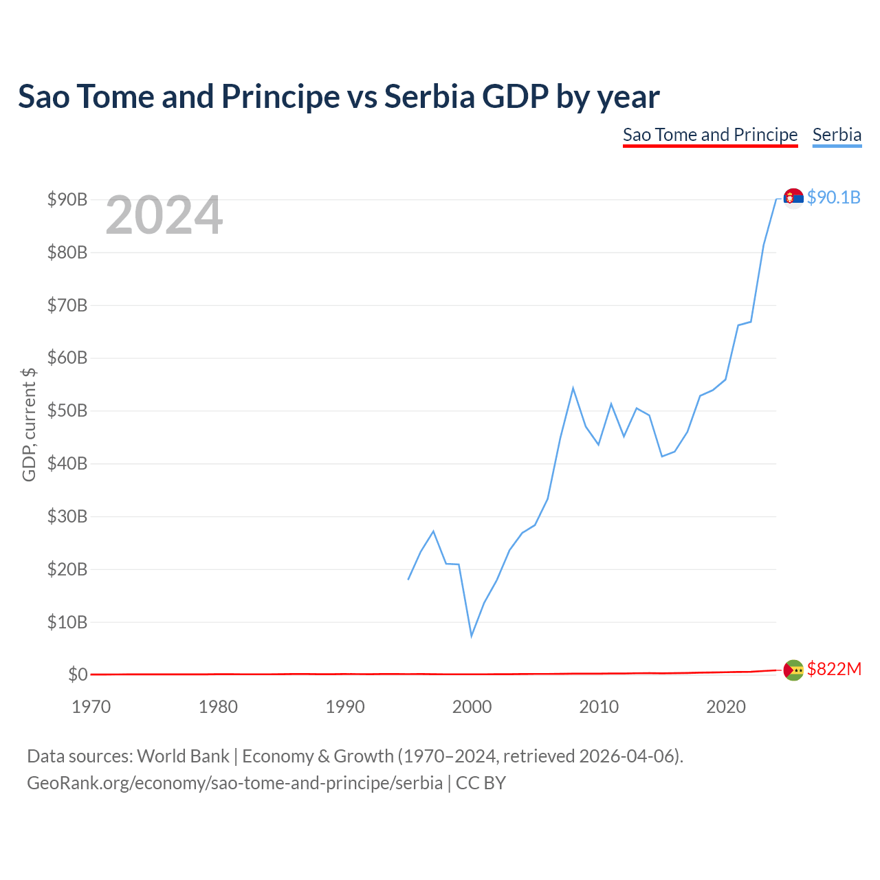 Sao Tome and Principe has a GDP of $822M compared to $90.1B for Serbia, ranking 189/197 and 76/197 by economy size, respectively.