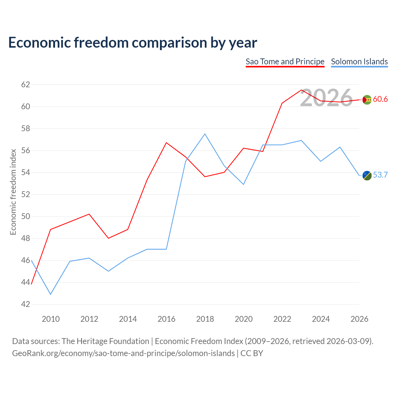 The Economic Freedom Index for Sao Tome and Principe is 60.6, ranking 93/197, compared to 53.7 for the Solomon Islands, ranking 137/197. The chart above displays a comparison of annual changes in economic freedom indexes.