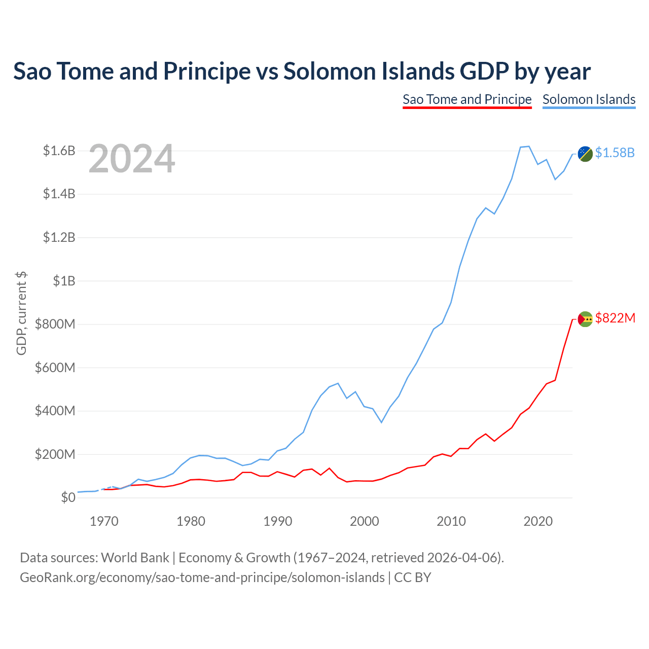Sao Tome and Principe has a GDP of $822M compared to $1.58B for the Solomon Islands, ranking 189/197 and 182/197 by economy size, respectively.