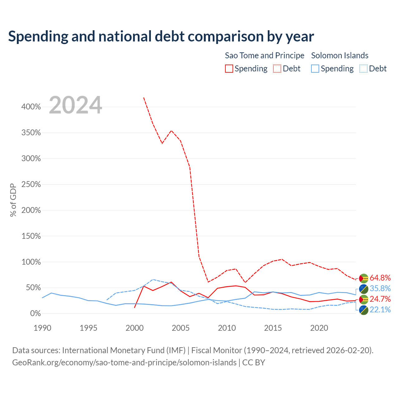 Sao Tome and Principe has $533M in government debt (64.8% of GDP), compared to $350M (22.1% of GDP) in the Solomon Islands.