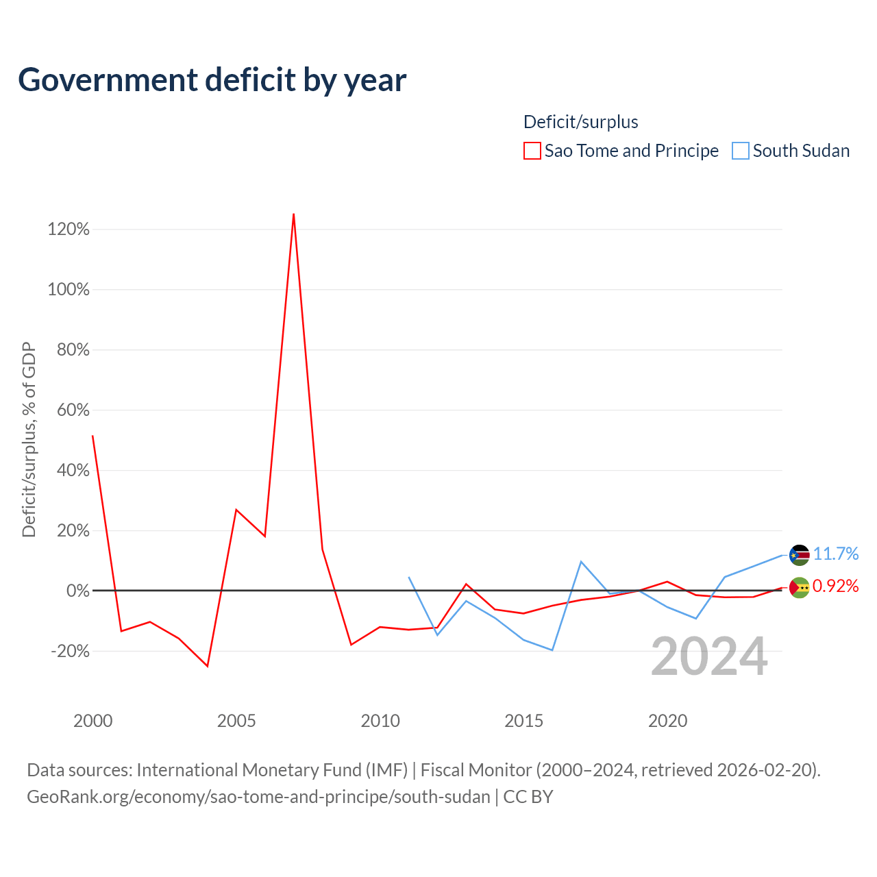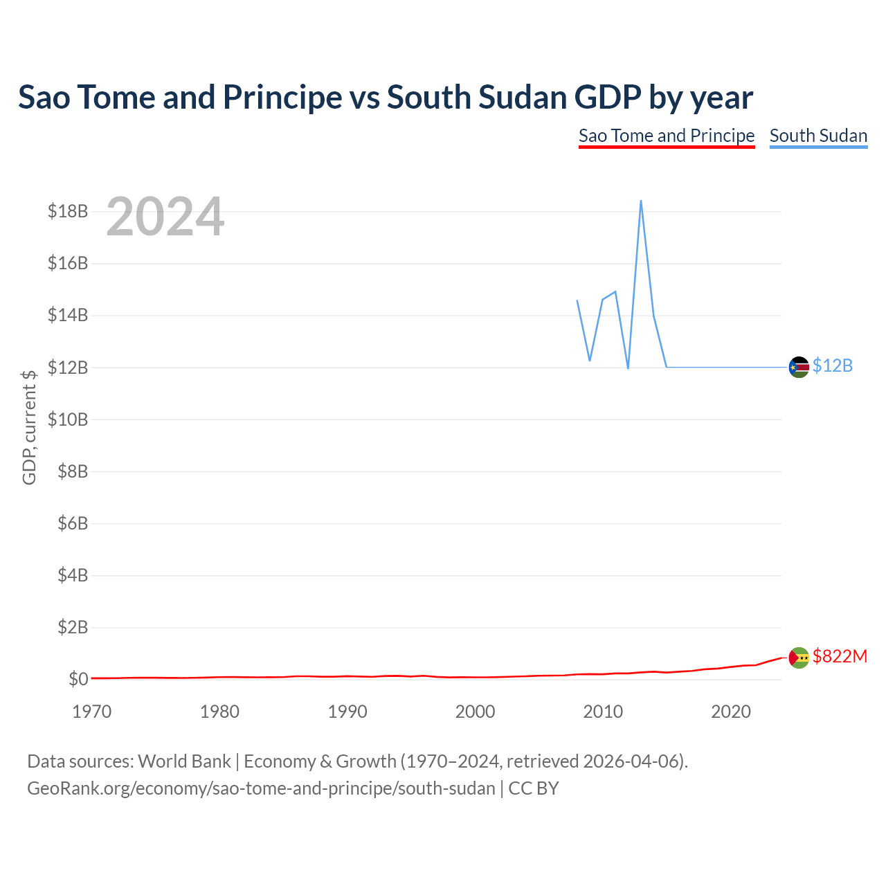 Sao Tome and Principe has a GDP of $822M compared to $12B for South Sudan, ranking 189/197 and 149/197 by economy size, respectively.