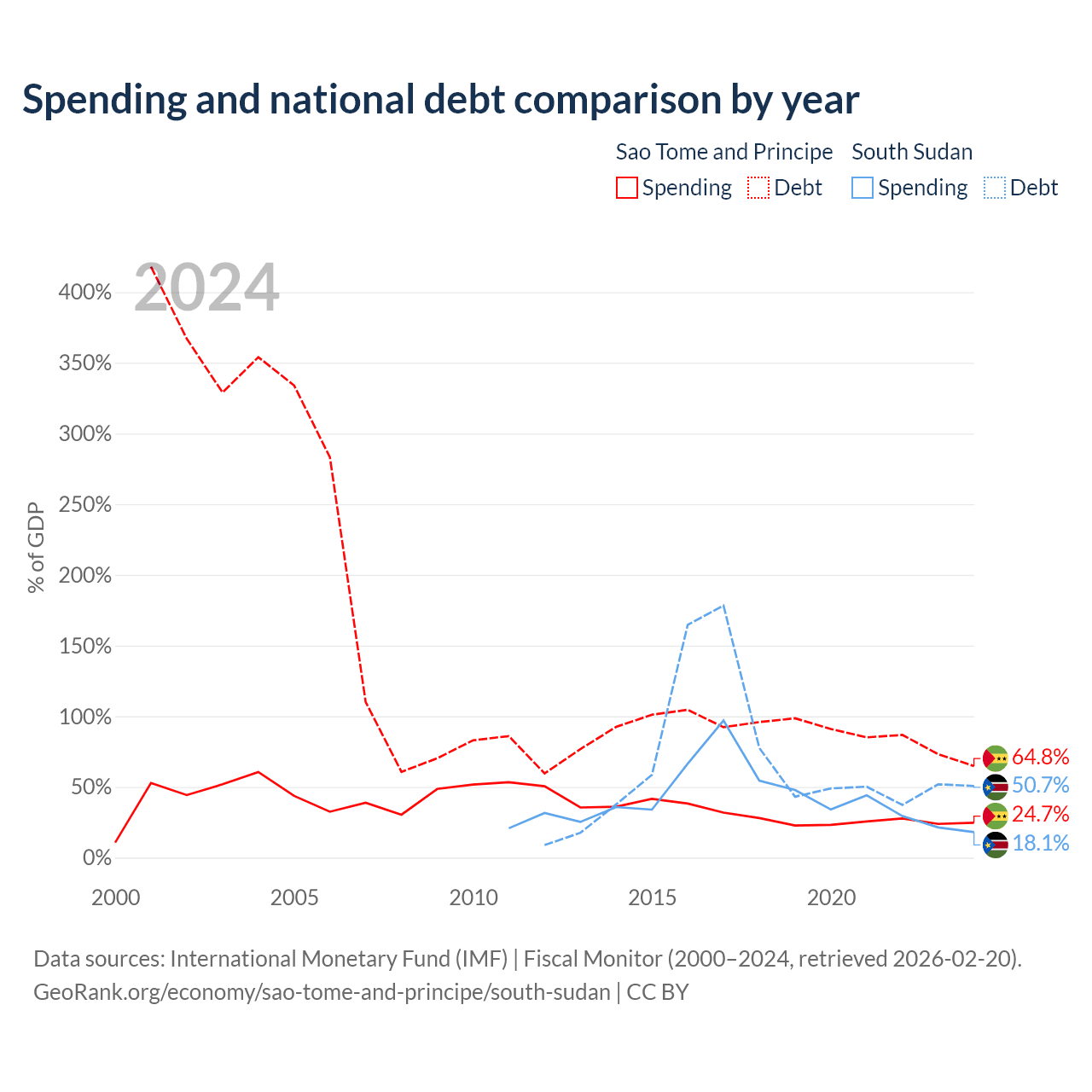 Sao Tome and Principe has $533M in government debt (64.8% of GDP), compared to $7.04B (50.7% of GDP) in South Sudan.