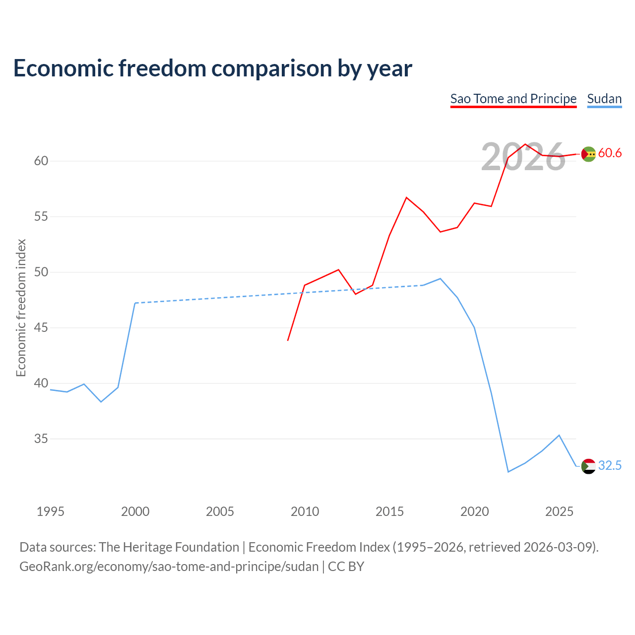 The Economic Freedom Index for Sao Tome and Principe is 60.6, ranking 93/197, compared to 32.5 for Sudan, ranking 191/197. The chart above displays a comparison of annual changes in economic freedom indexes.