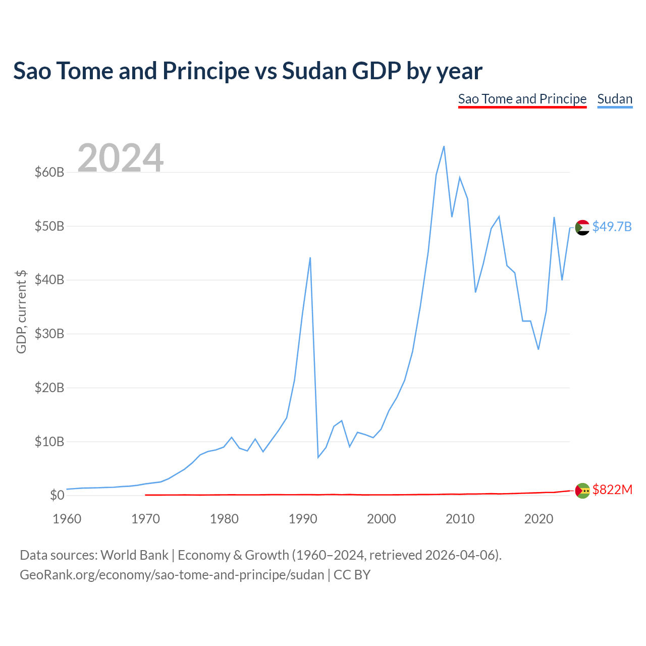 Sao Tome and Principe has a GDP of $822M compared to $49.7B for Sudan, ranking 189/197 and 94/197 by economy size, respectively.