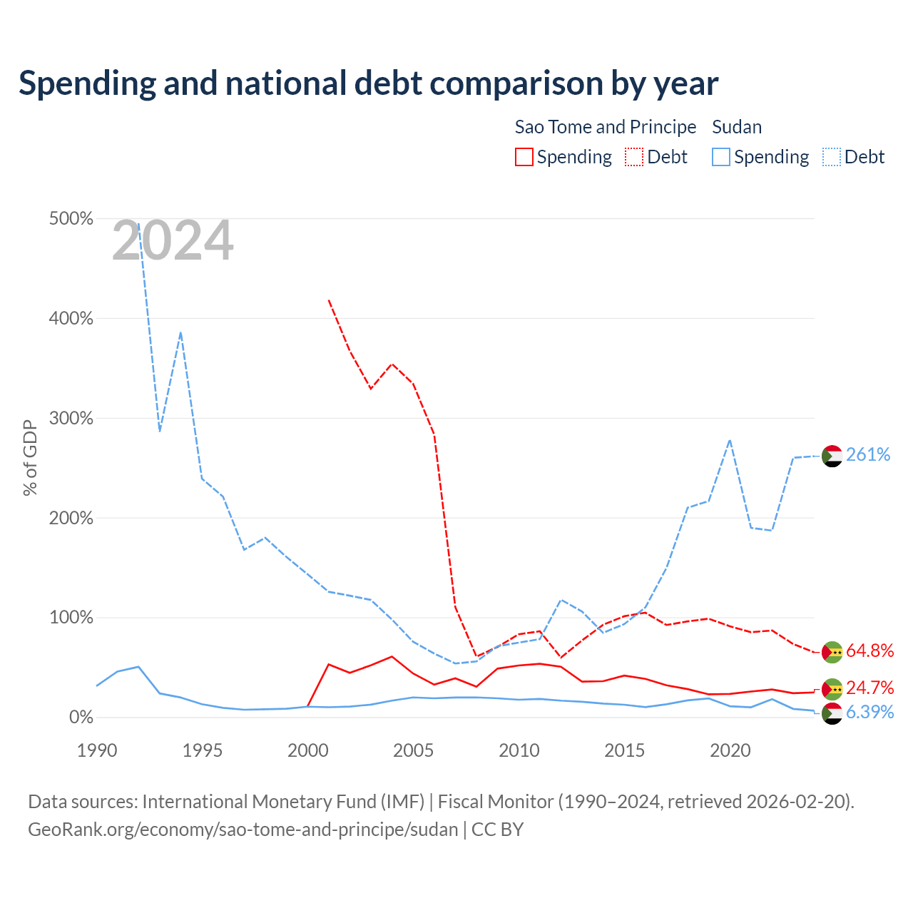 Sao Tome and Principe has $533M in government debt (64.8% of GDP), compared to $130B (261.4% of GDP) in Sudan.