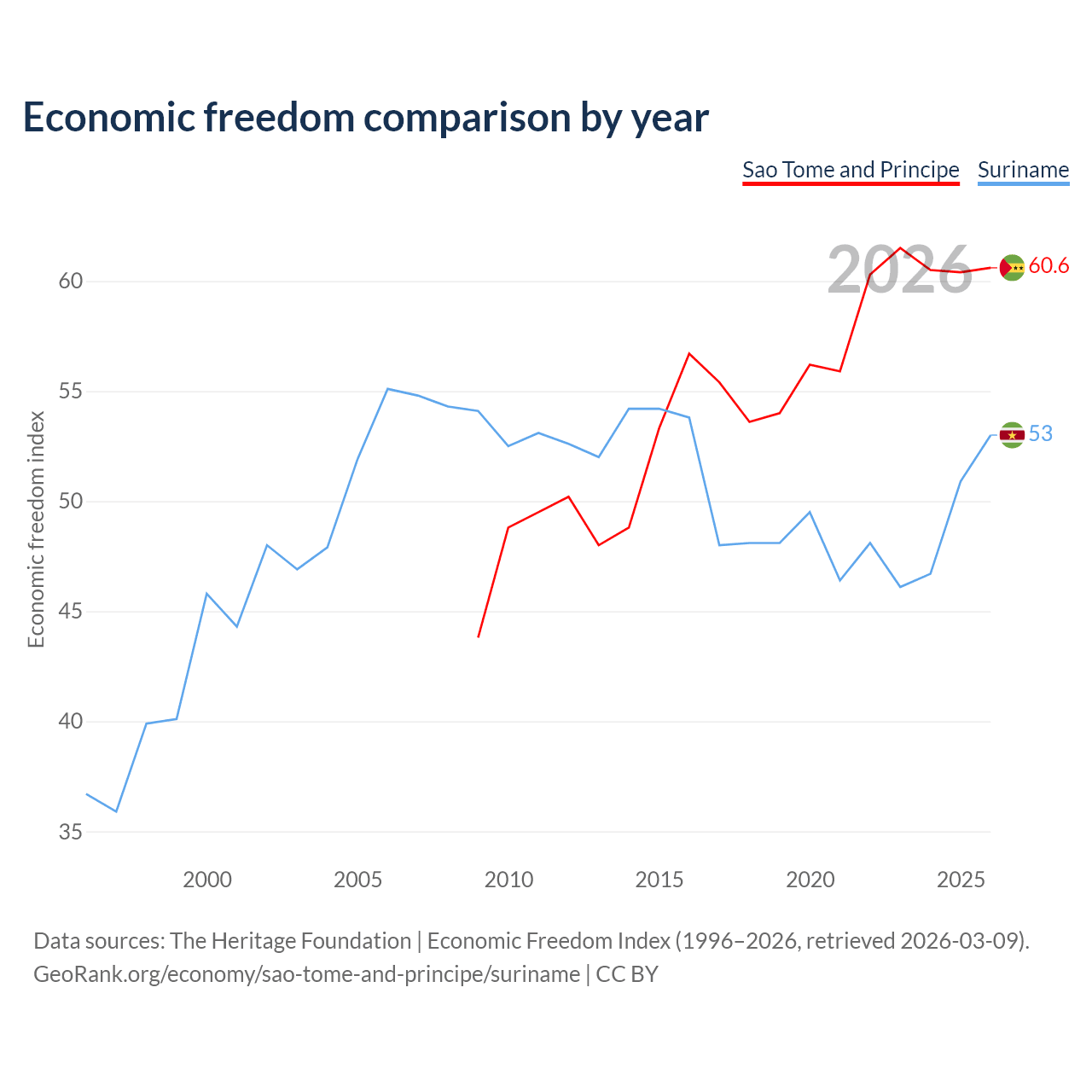 The Economic Freedom Index for Sao Tome and Principe is 60.6, ranking 93/197, compared to 53 for Suriname, ranking 143/197. The chart above displays a comparison of annual changes in economic freedom indexes.