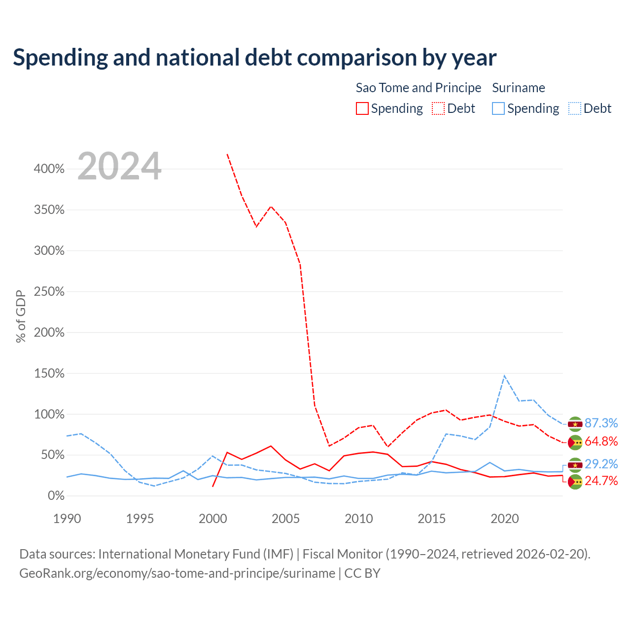 Sao Tome and Principe has $533M in government debt (64.8% of GDP), compared to $3.86B (87.3% of GDP) in Suriname.