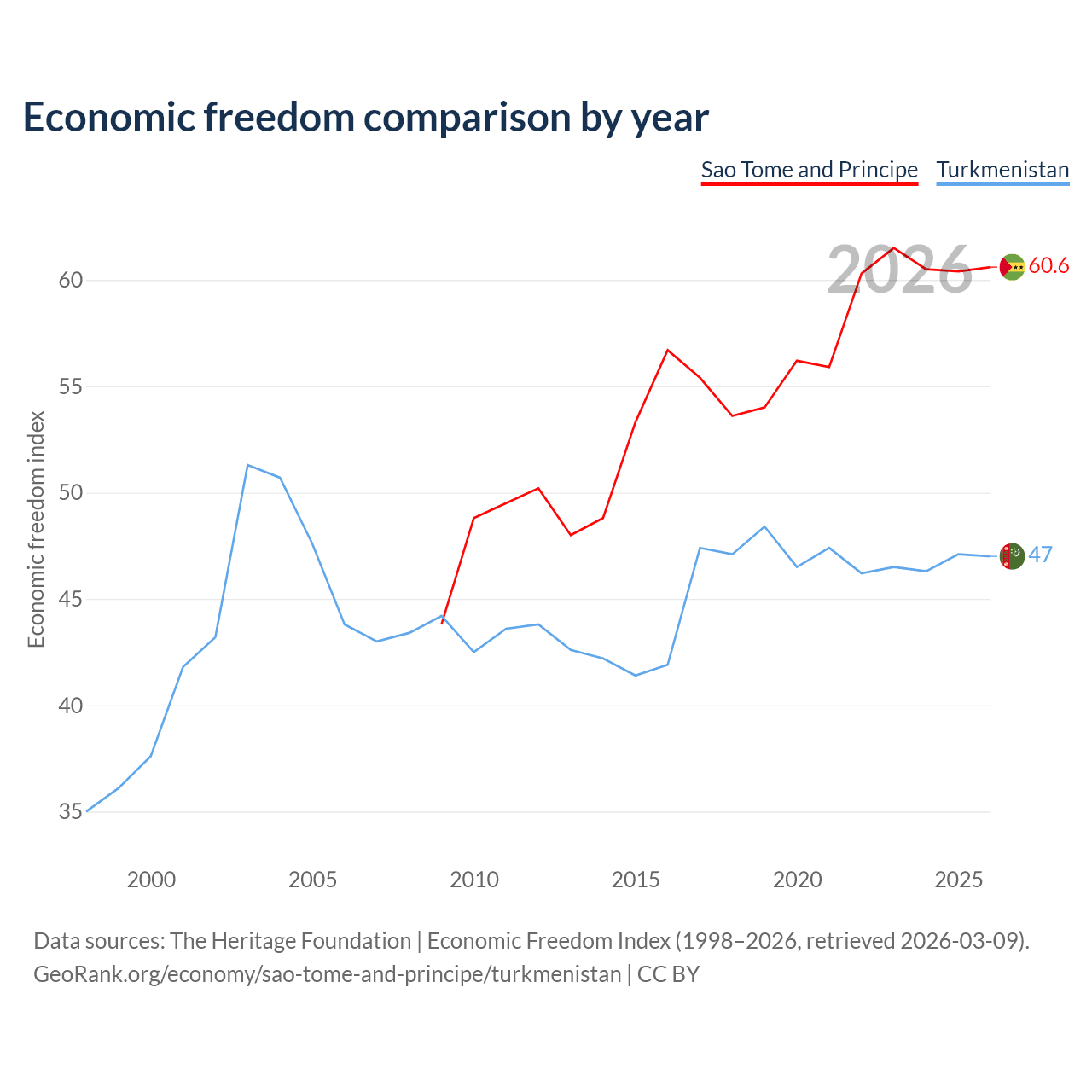 The Economic Freedom Index for Sao Tome and Principe is 60.6, ranking 93/197, compared to 47 for Turkmenistan, ranking 177/197. The chart above displays a comparison of annual changes in economic freedom indexes.