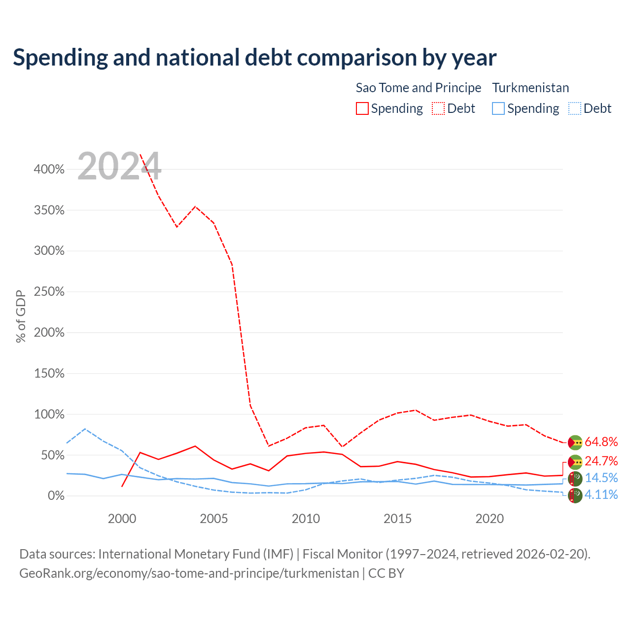 Sao Tome and Principe has $533M in government debt (64.8% of GDP), compared to $2.11B (4.11% of GDP) in Turkmenistan.