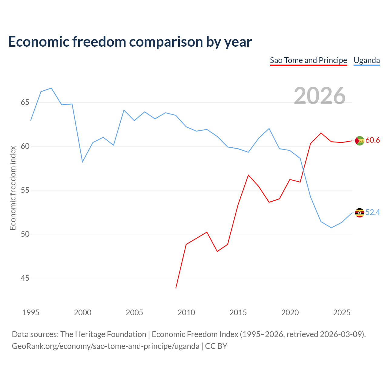 The Economic Freedom Index for Sao Tome and Principe is 60.6, ranking 93/197, compared to 52.4 for Uganda, ranking 149/197. The chart above displays a comparison of annual changes in economic freedom indexes.