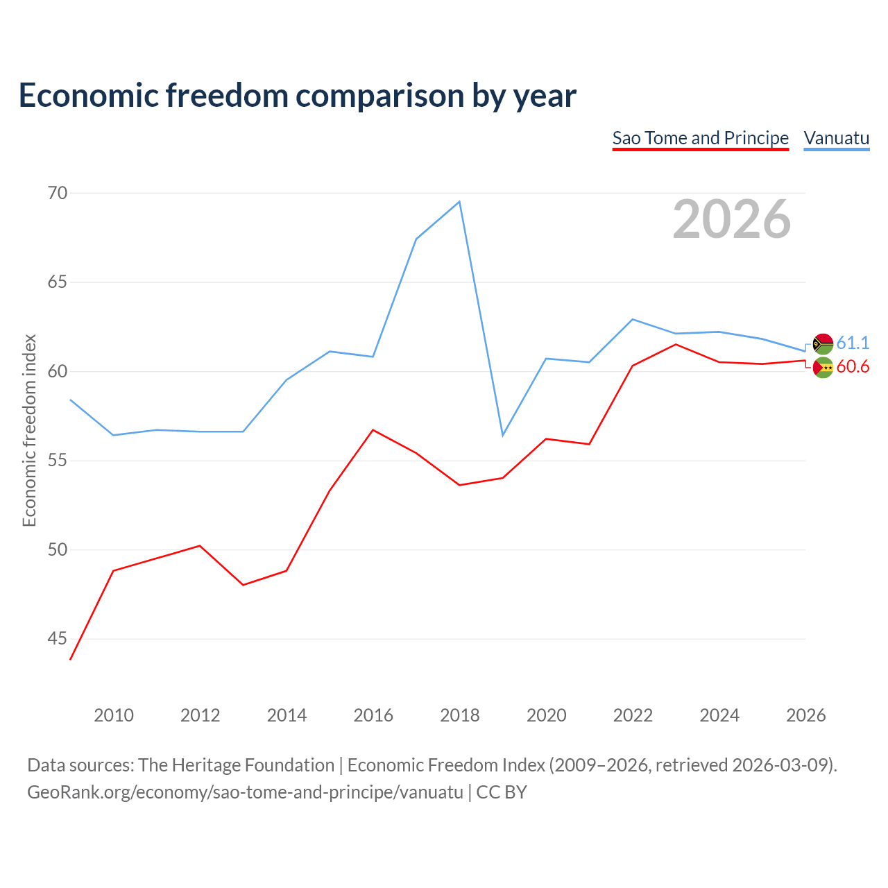 The Economic Freedom Index for Sao Tome and Principe is 60.6, ranking 93/197, compared to 61.1 for Vanuatu, ranking 92/197. The chart above displays a comparison of annual changes in economic freedom indexes.