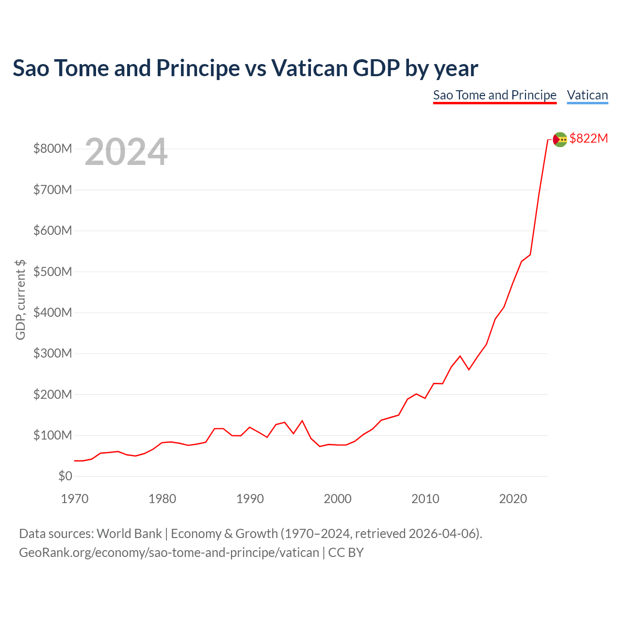 Sao Tome and Principe has a GDP of $822M compared to $19.8M for the Vatican, ranking 189/197 and 197/197 by economy size, respectively.