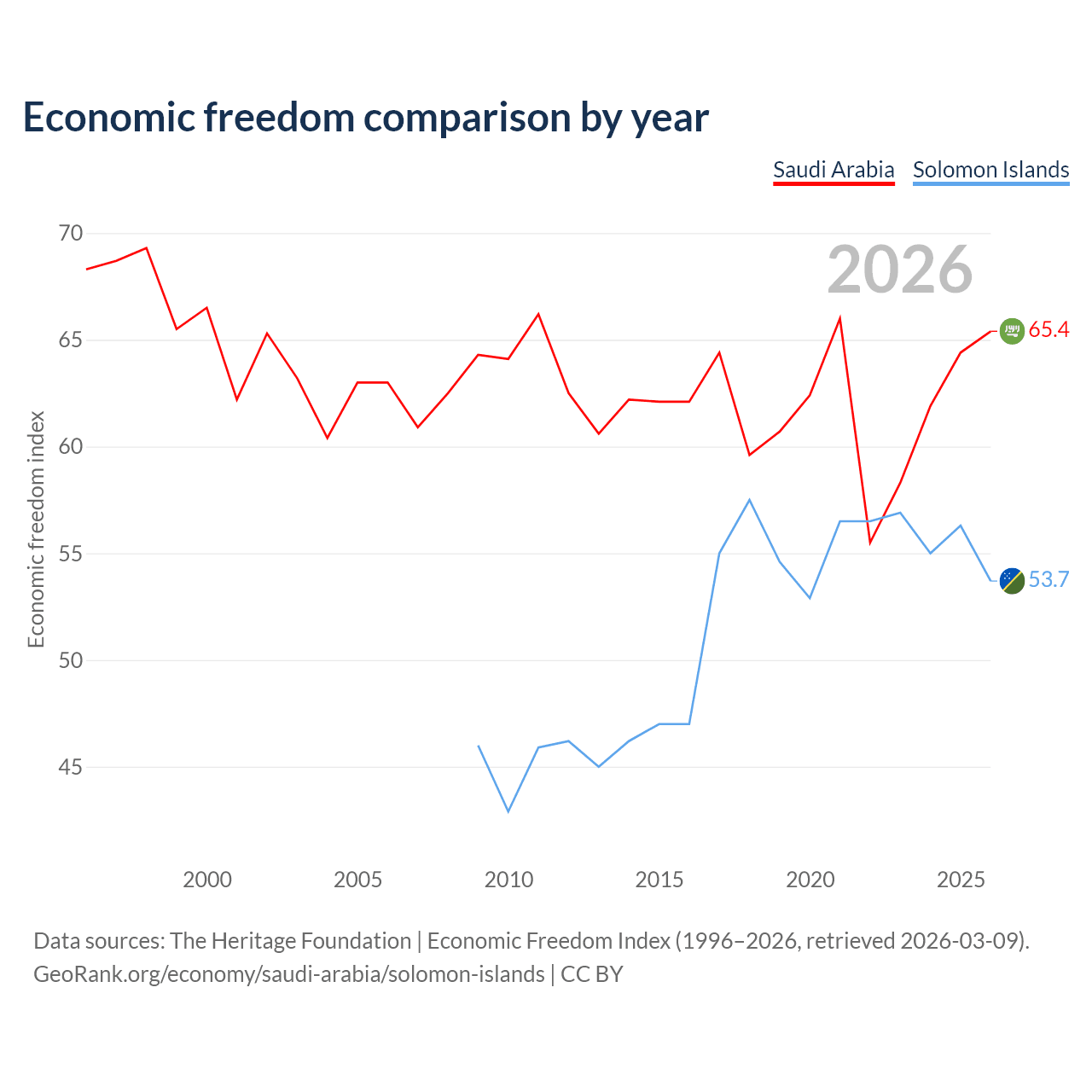 The Economic Freedom Index for Saudi Arabia is 65.4, ranking 65/197, compared to 53.7 for the Solomon Islands, ranking 137/197. The chart above displays a comparison of annual changes in economic freedom indexes.