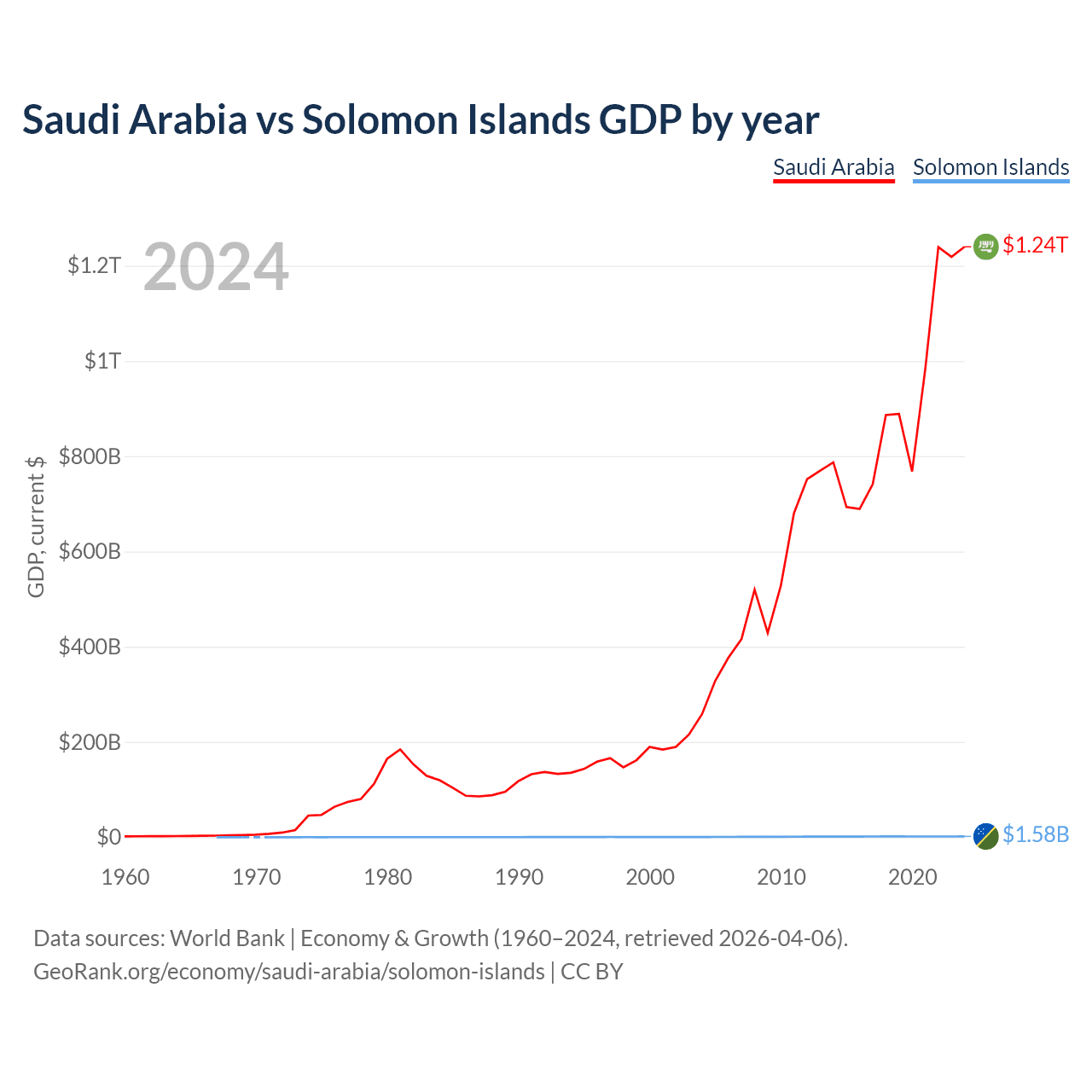 Saudi Arabia has a GDP of $1.24T compared to $1.58B for the Solomon Islands, ranking 18/197 and 182/197 by economy size, respectively.