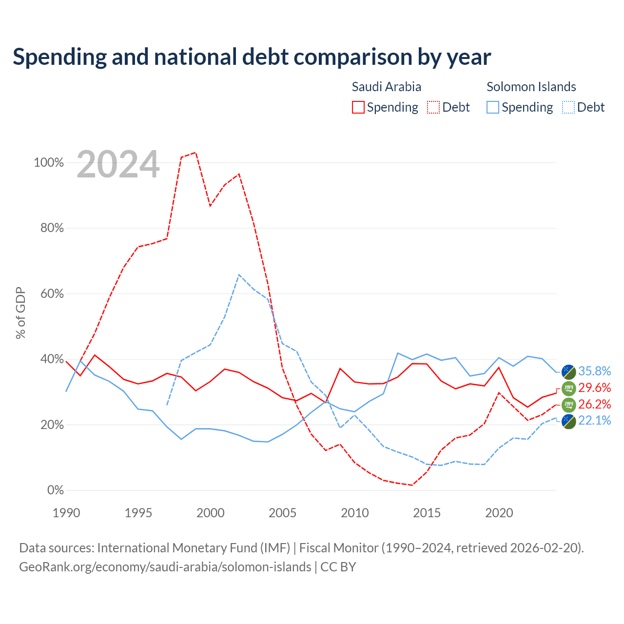 Saudi Arabia has $324B in government debt (26.2% of GDP), compared to $350M (22.1% of GDP) in the Solomon Islands.