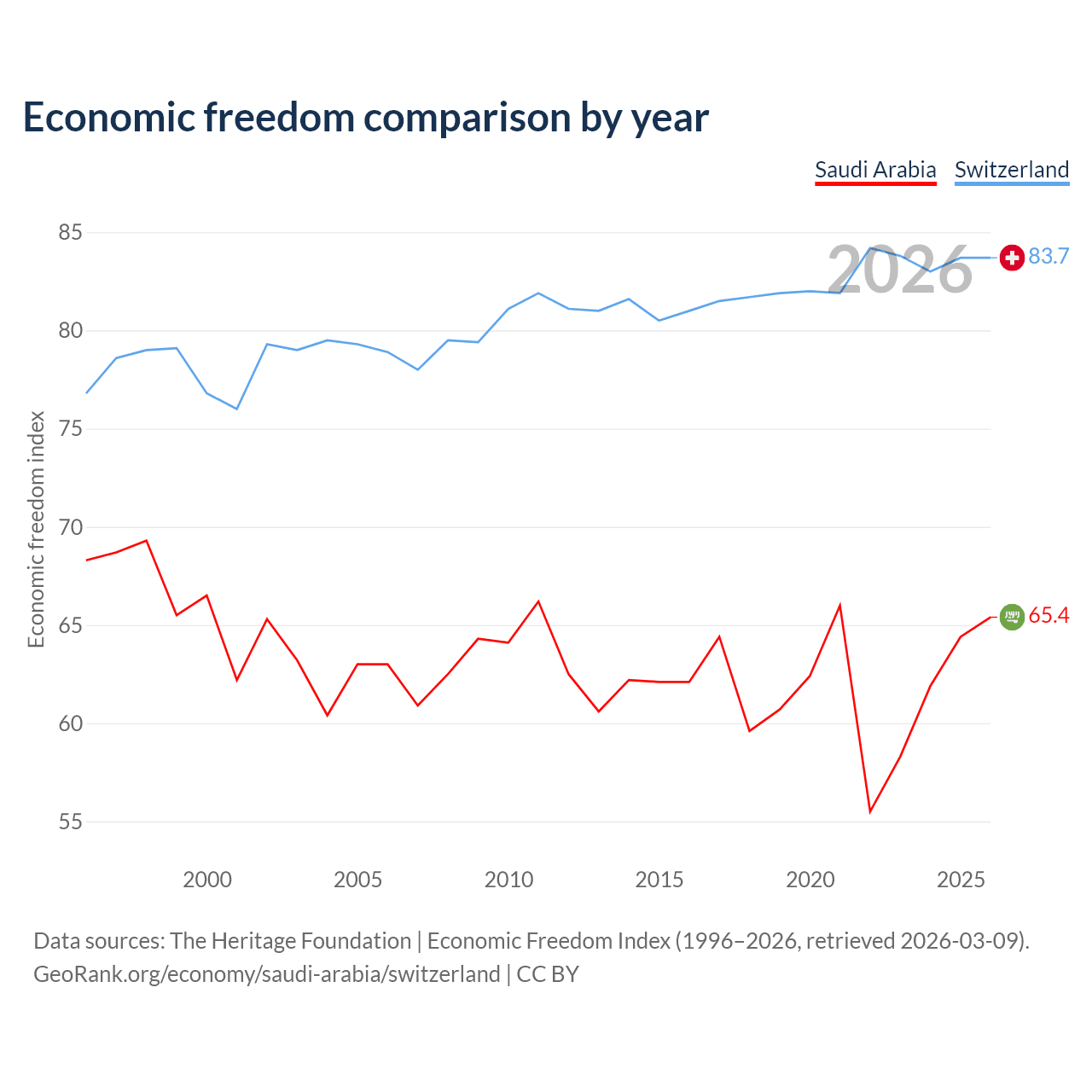 The Economic Freedom Index for Saudi Arabia is 65.4, ranking 65/197, compared to 83.7 for Switzerland, ranking 2/197. The chart above displays a comparison of annual changes in economic freedom indexes.