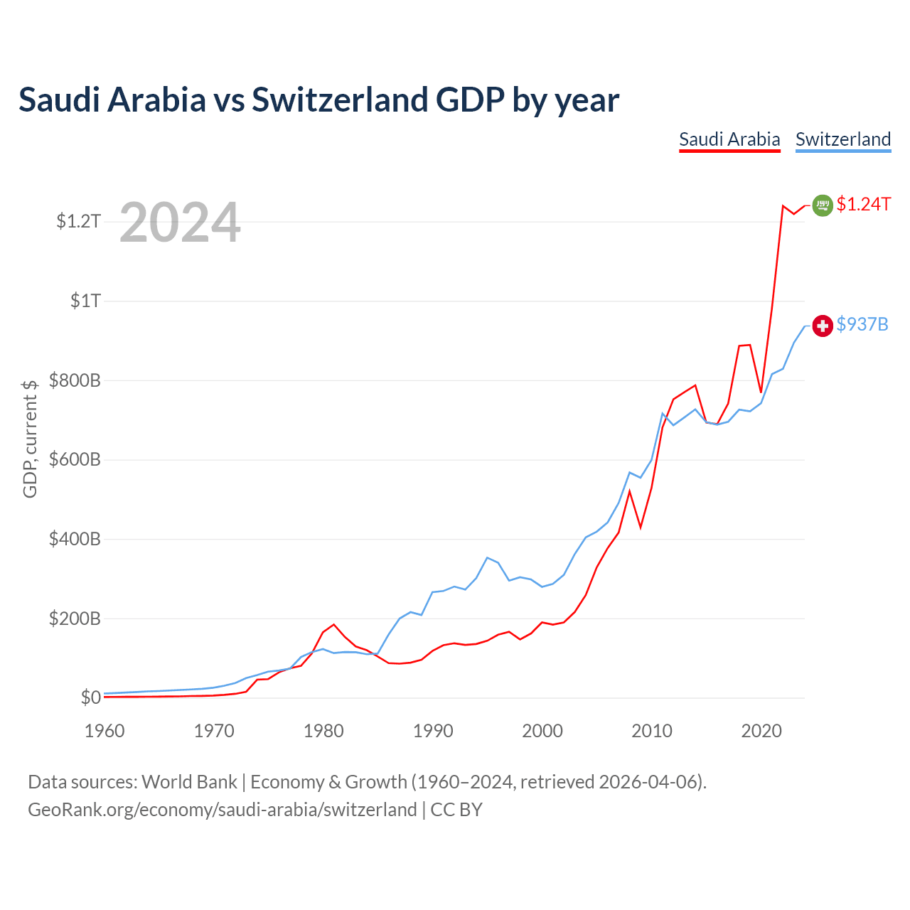 Saudi Arabia vs Switzerland GDP by year