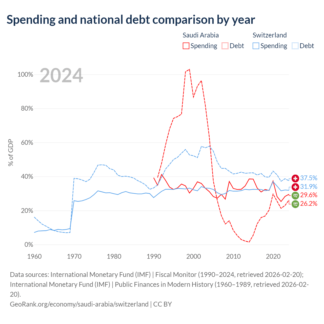 Saudi Arabia has $324B in government debt (26.2% of GDP), compared to $351B (37.5% of GDP) in Switzerland.