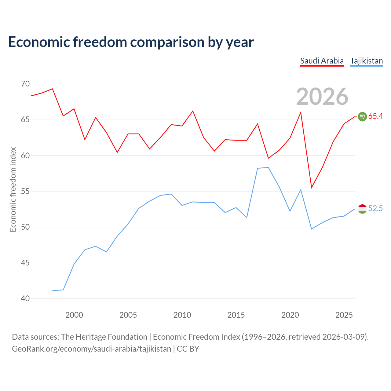 The Economic Freedom Index for Saudi Arabia is 65.4, ranking 65/197, compared to 52.5 for Tajikistan, ranking 147/197. The chart above displays a comparison of annual changes in economic freedom indexes.