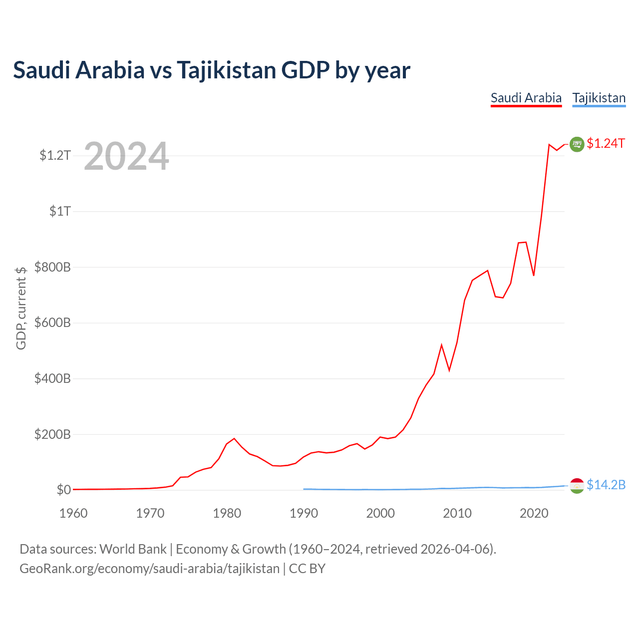 Saudi Arabia has a GDP of $1.24T compared to $14.2B for Tajikistan, ranking 18/197 and 145/197 by economy size, respectively.