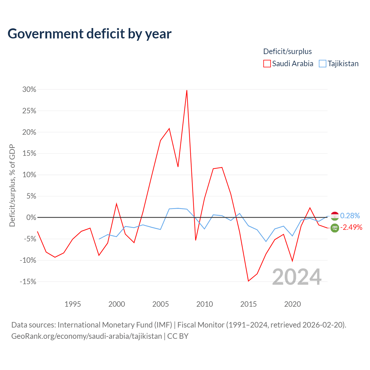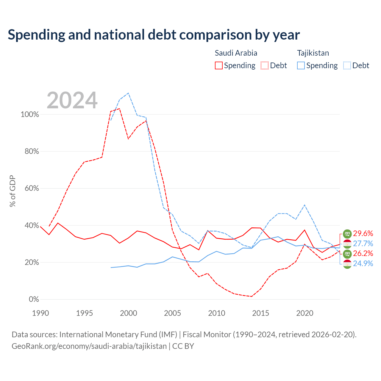 Saudi Arabia has $324B in government debt (26.2% of GDP), compared to $3.54B (24.9% of GDP) in Tajikistan.