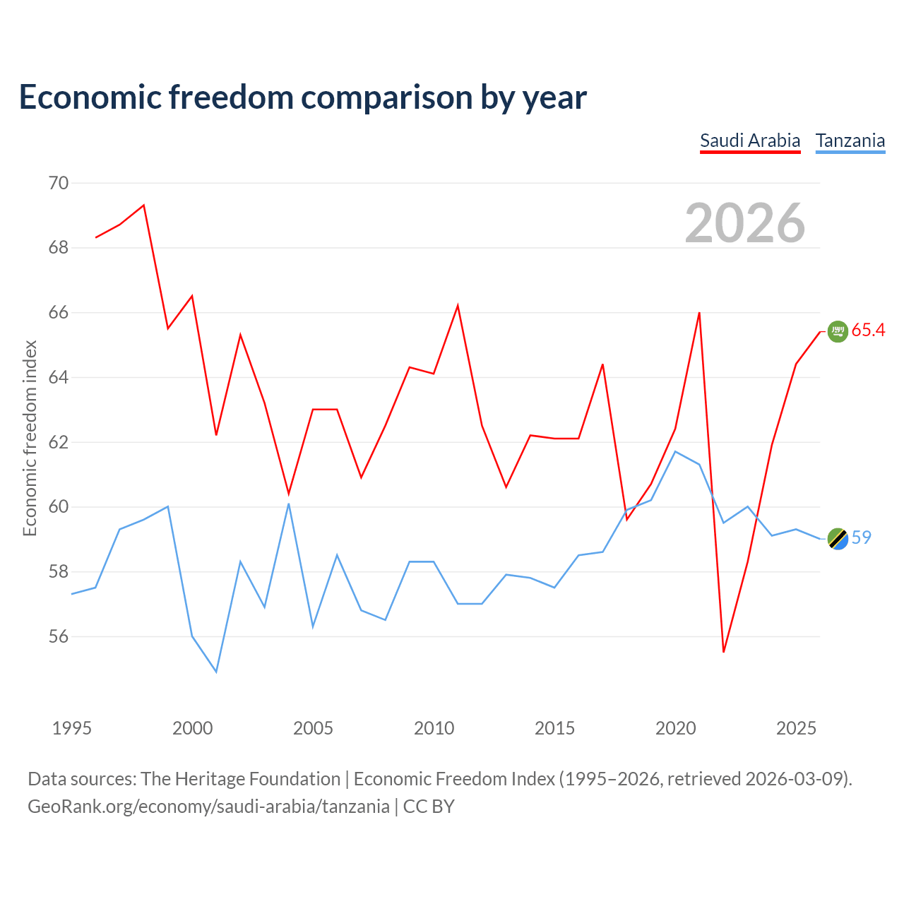 The Economic Freedom Index for Saudi Arabia is 65.4, ranking 65/197, compared to 59 for Tanzania, ranking 106/197. The chart above displays a comparison of annual changes in economic freedom indexes.