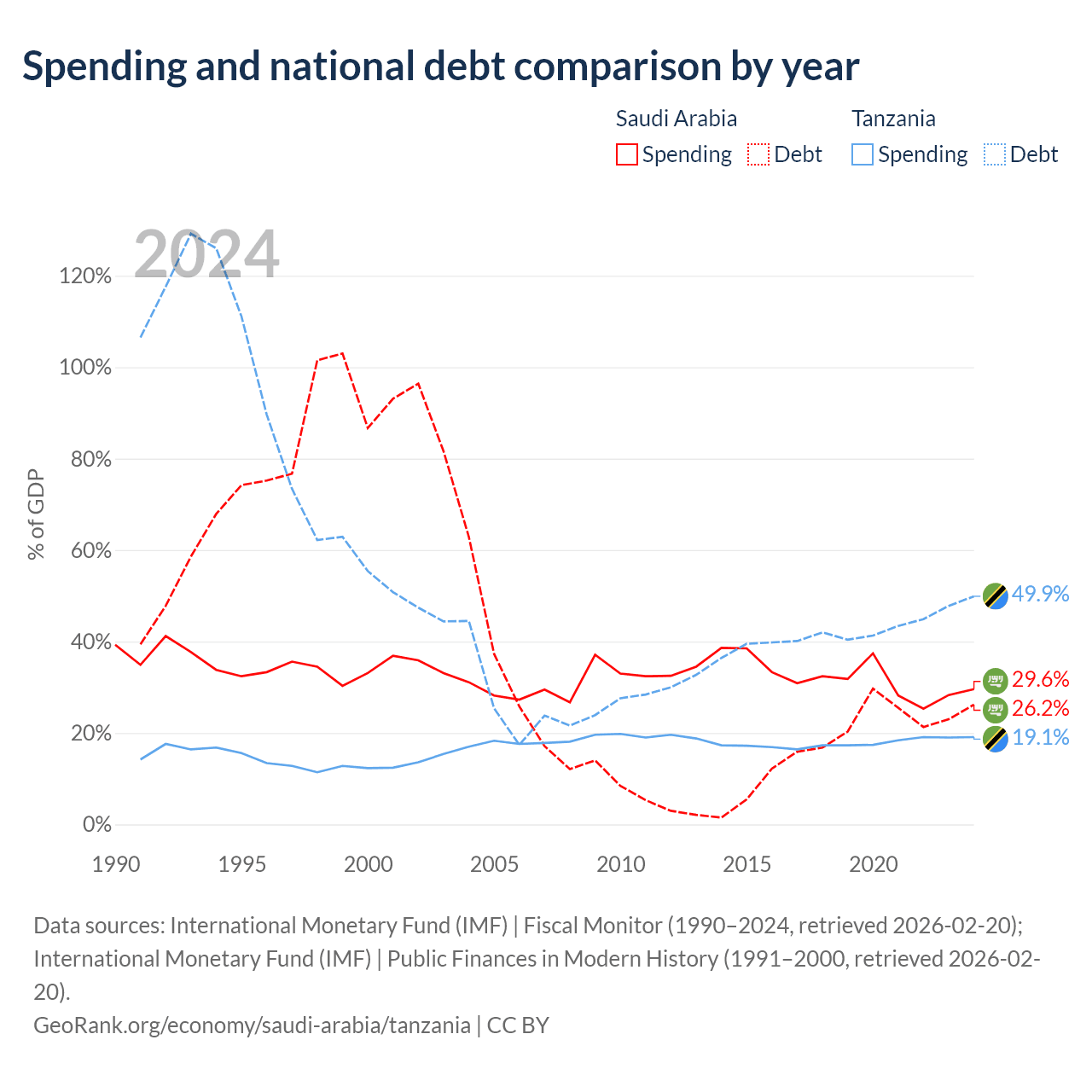 Saudi Arabia has $324B in government debt (26.2% of GDP), compared to $39.3B (49.9% of GDP) in Tanzania.