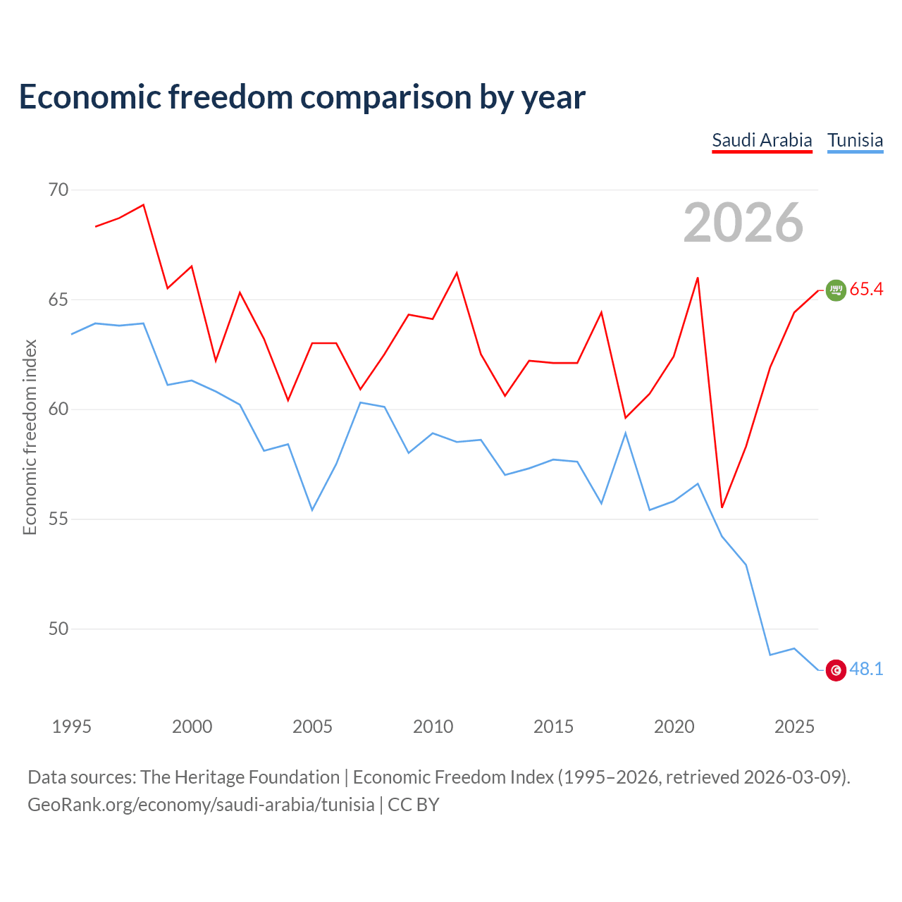 The Economic Freedom Index for Saudi Arabia is 65.4, ranking 65/197, compared to 48.1 for Tunisia, ranking 172/197. The chart above displays a comparison of annual changes in economic freedom indexes.
