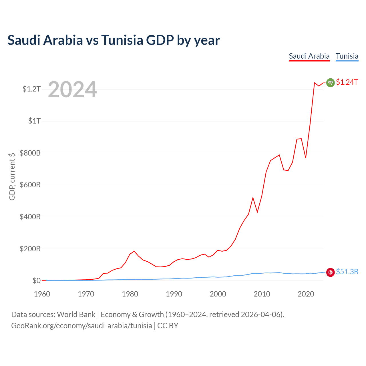 Saudi Arabia has a GDP of $1.24T compared to $51.3B for Tunisia, ranking 18/197 and 93/197 by economy size, respectively.
