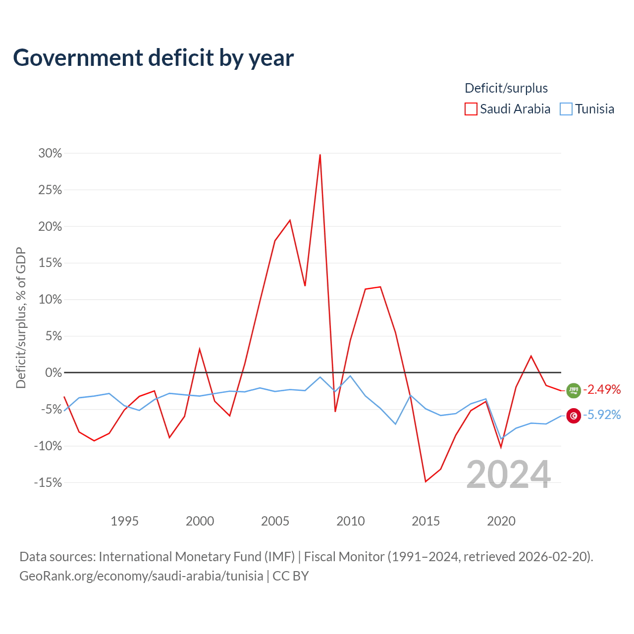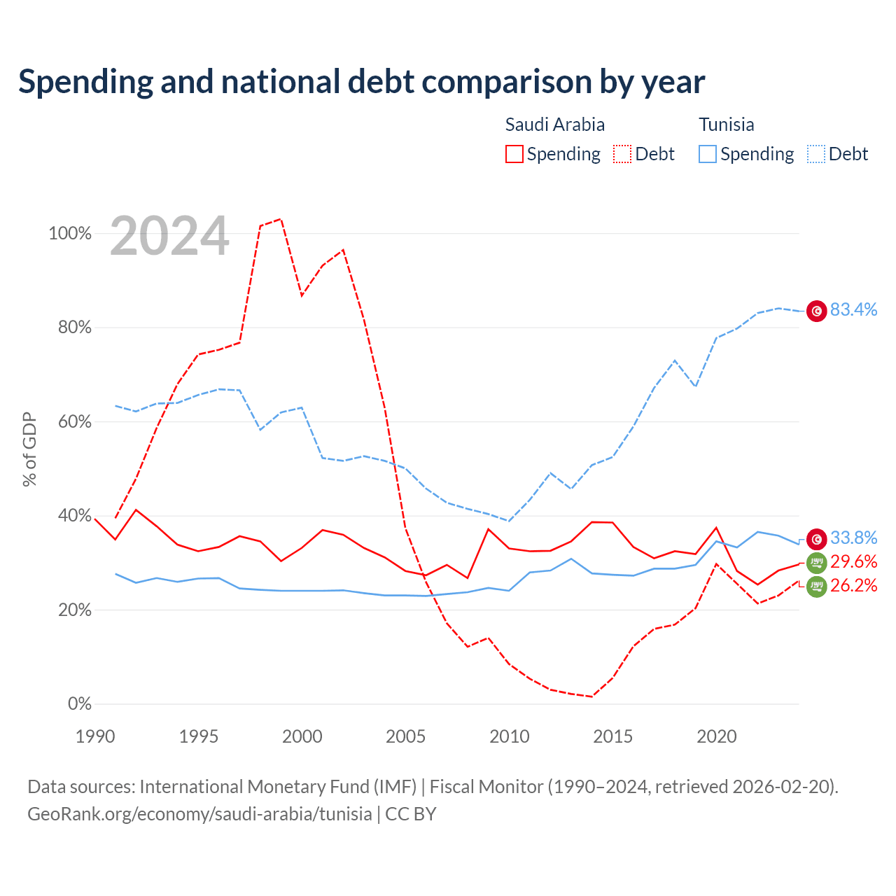 Saudi Arabia has $324B in government debt (26.2% of GDP), compared to $42.8B (83.4% of GDP) in Tunisia.