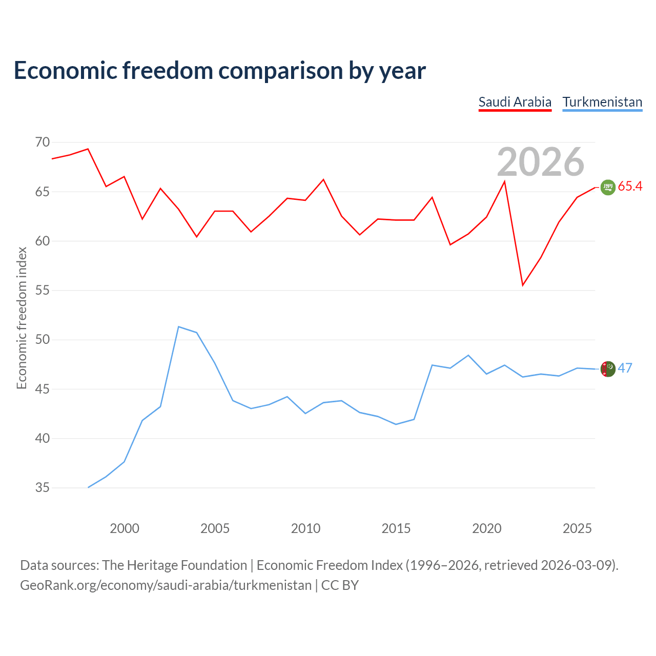 The Economic Freedom Index for Saudi Arabia is 65.4, ranking 65/197, compared to 47 for Turkmenistan, ranking 177/197. The chart above displays a comparison of annual changes in economic freedom indexes.
