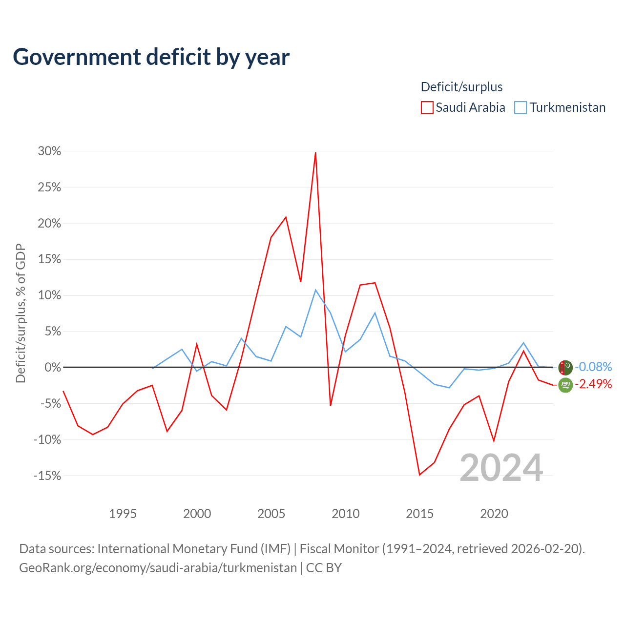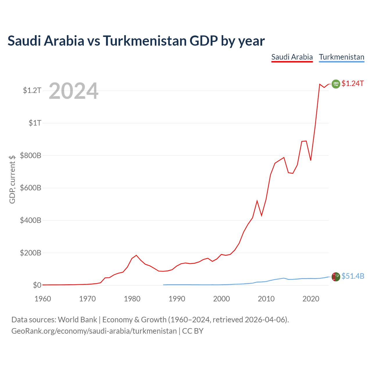 Saudi Arabia has a GDP of $1.24T compared to $51.4B for Turkmenistan, ranking 18/197 and 92/197 by economy size, respectively.