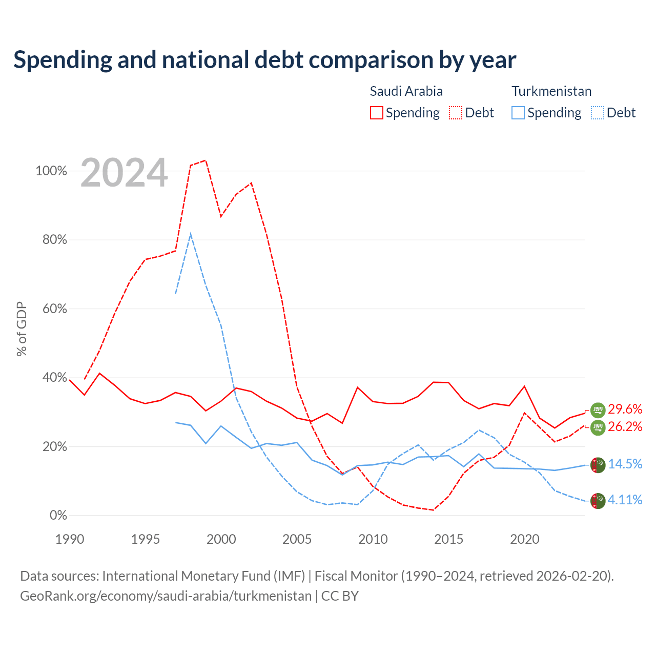Saudi Arabia has $324B in government debt (26.2% of GDP), compared to $2.11B (4.11% of GDP) in Turkmenistan.