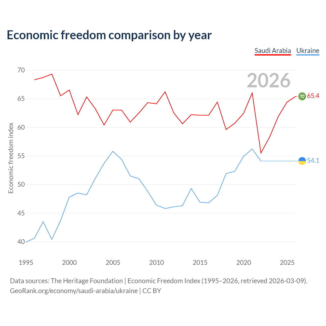 The Economic Freedom Index for Saudi Arabia is 65.4, ranking 65/197, compared to 54.1 for Ukraine, ranking 135/197. The chart above displays a comparison of annual changes in economic freedom indexes.