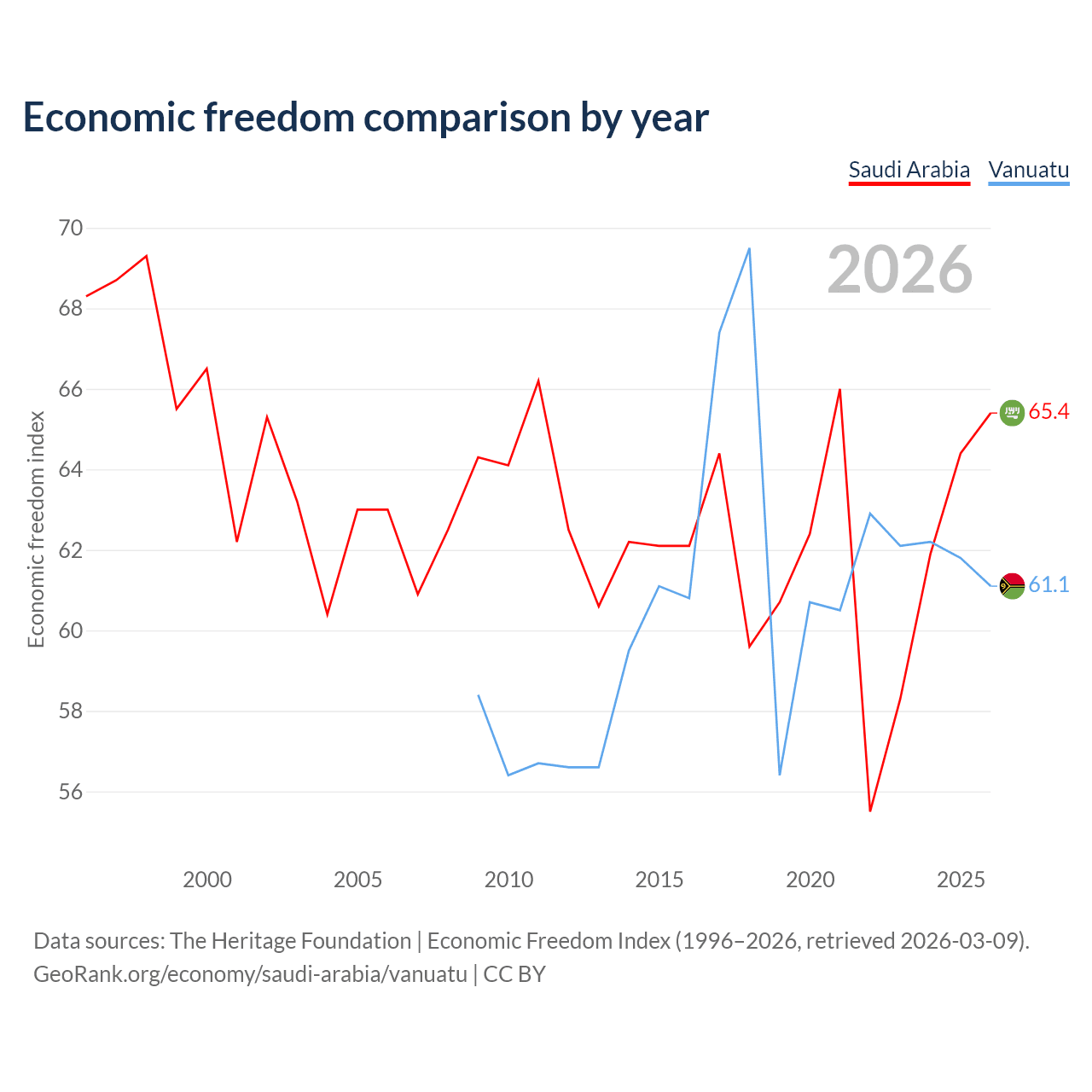 The Economic Freedom Index for Saudi Arabia is 65.4, ranking 65/197, compared to 61.1 for Vanuatu, ranking 92/197. The chart above displays a comparison of annual changes in economic freedom indexes.