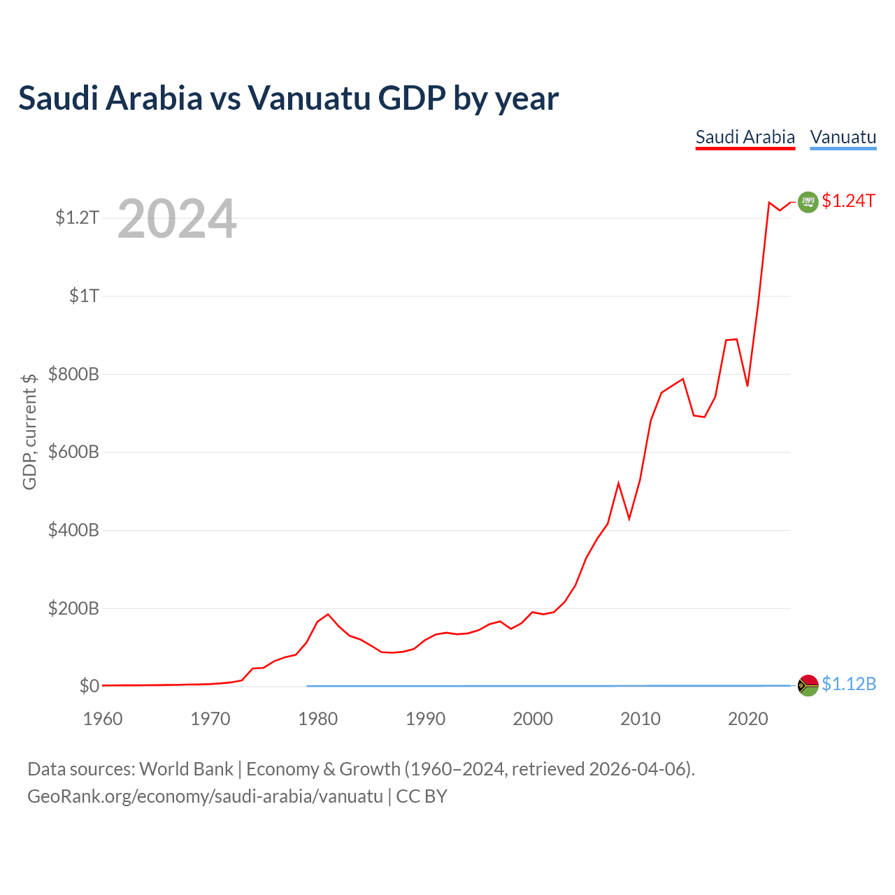 Saudi Arabia has a GDP of $1.24T compared to $1.12B for Vanuatu, ranking 18/197 and 188/197 by economy size, respectively.