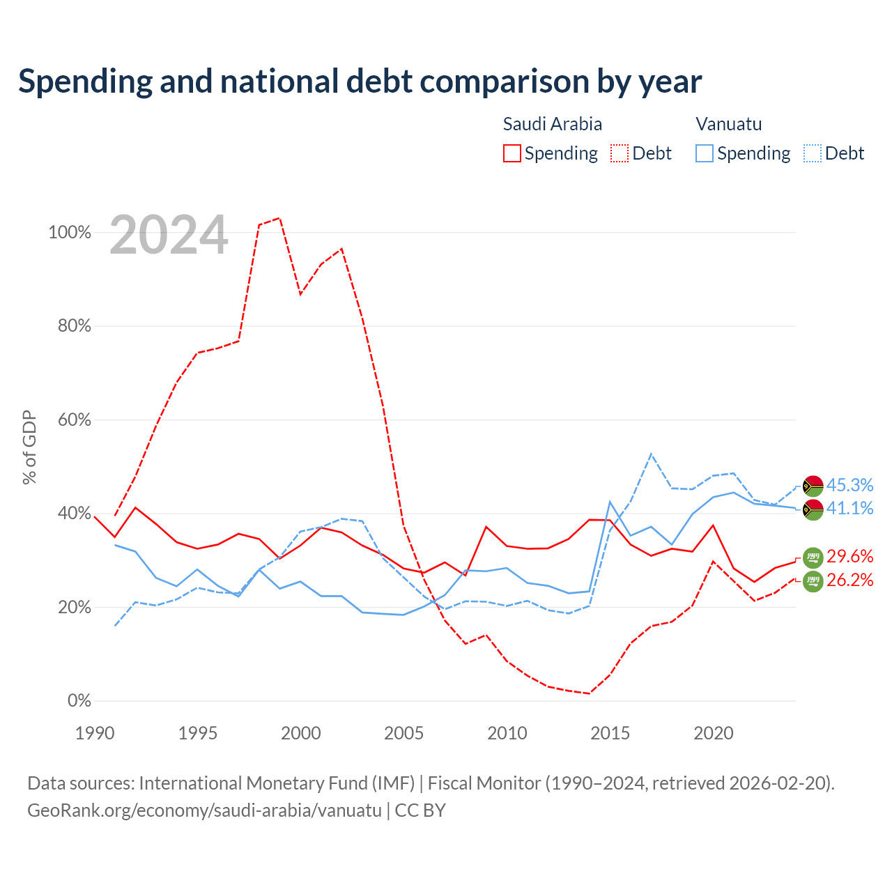 Saudi Arabia has $324B in government debt (26.2% of GDP), compared to $507M (45.3% of GDP) in Vanuatu.