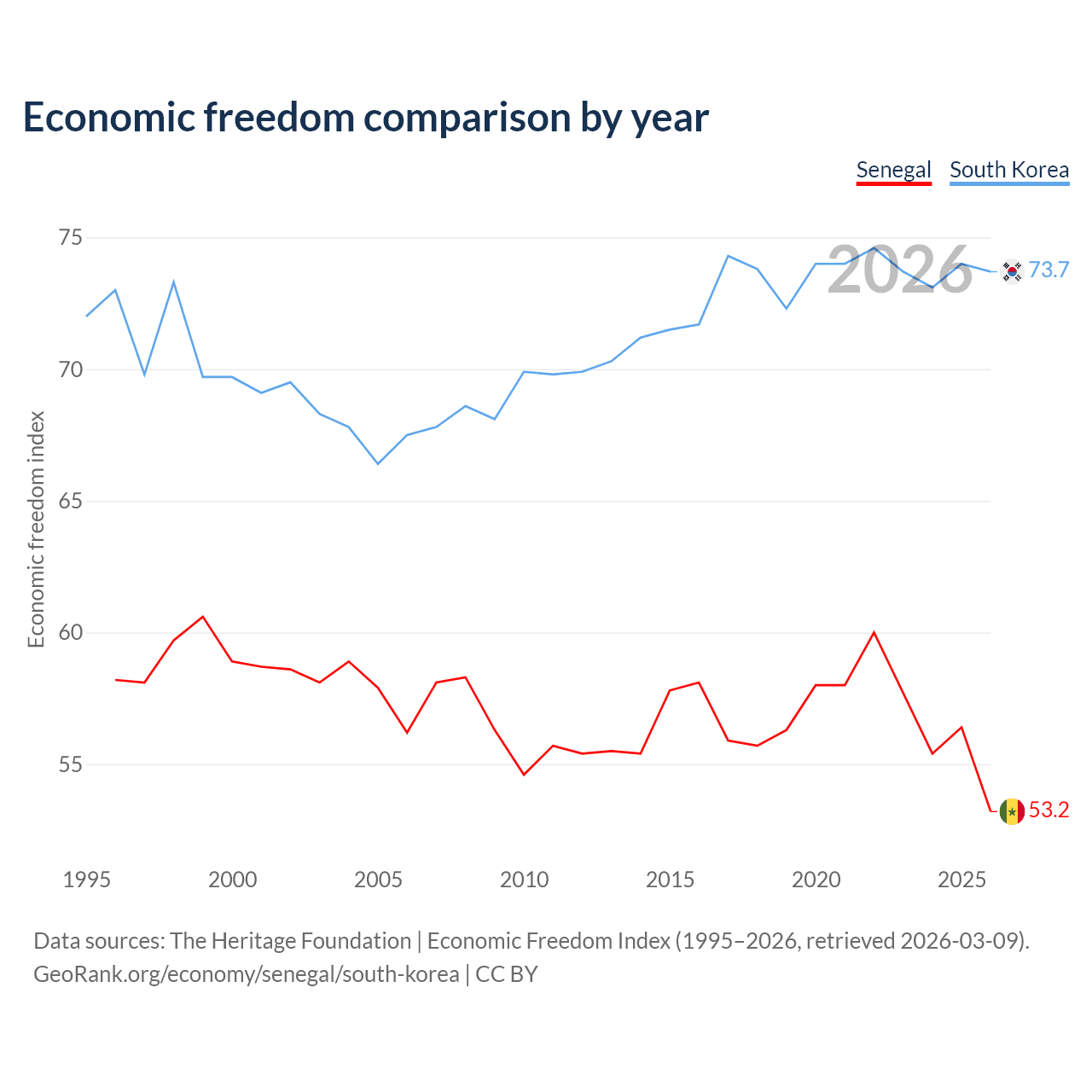 The Economic Freedom Index for Senegal is 53.2, ranking 140/197, compared to 73.7 for South Korea, ranking 24/197. The chart above displays a comparison of annual changes in economic freedom indexes.