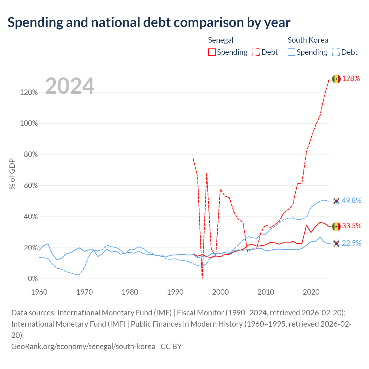 Senegal has $42.1B in government debt (128.4% of GDP), compared to $934B (49.8% of GDP) in South Korea.
