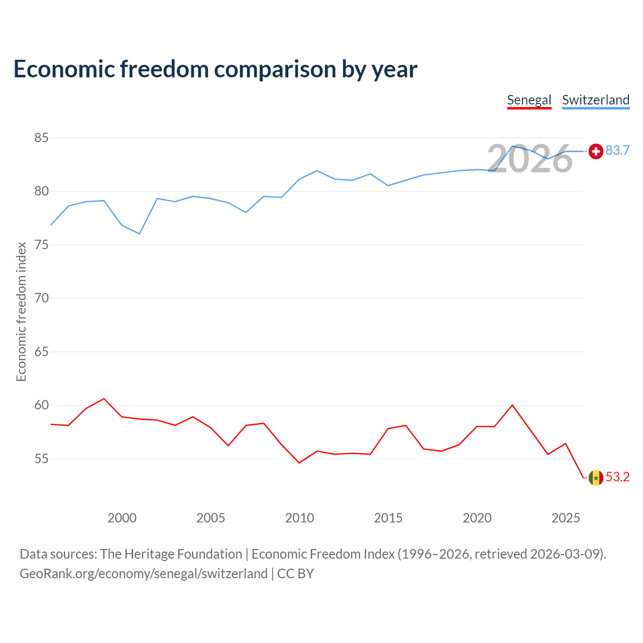 The Economic Freedom Index for Senegal is 53.2, ranking 140/197, compared to 83.7 for Switzerland, ranking 2/197. The chart above displays a comparison of annual changes in economic freedom indexes.