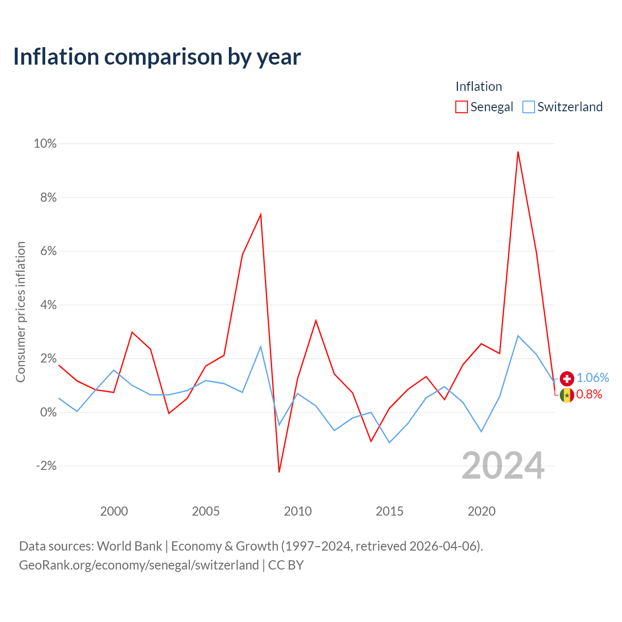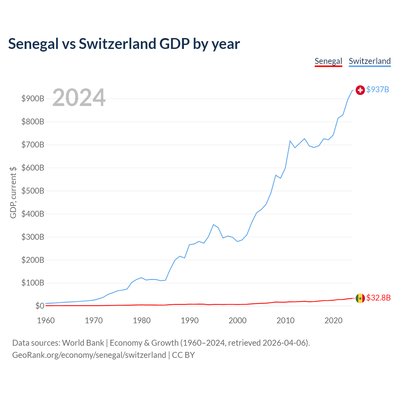 Senegal has a GDP of $32.8B compared to $937B for Switzerland, ranking 109/197 and 20/197 by economy size, respectively.