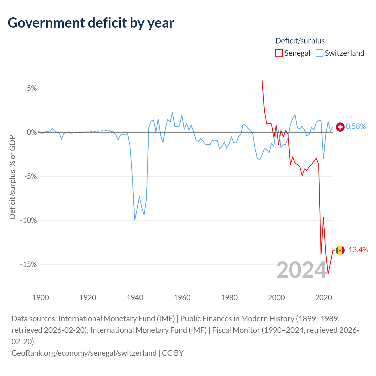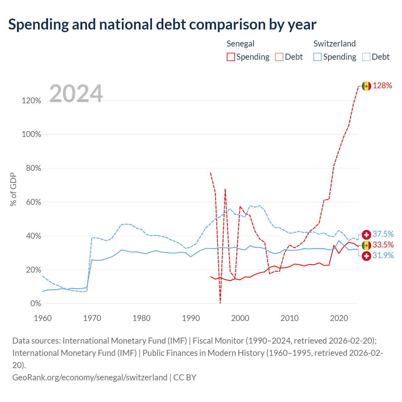 Senegal has $42.1B in government debt (128.4% of GDP), compared to $351B (37.5% of GDP) in Switzerland.