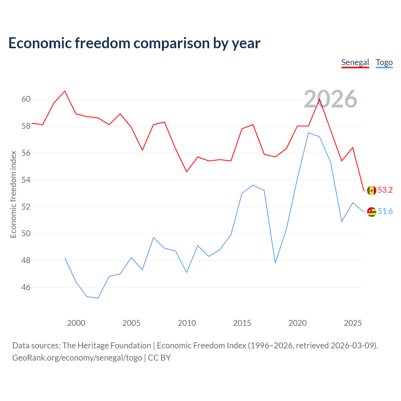 The Economic Freedom Index for Senegal is 53.2, ranking 140/197, compared to 51.6 for Togo, ranking 153/197. The chart above displays a comparison of annual changes in economic freedom indexes.