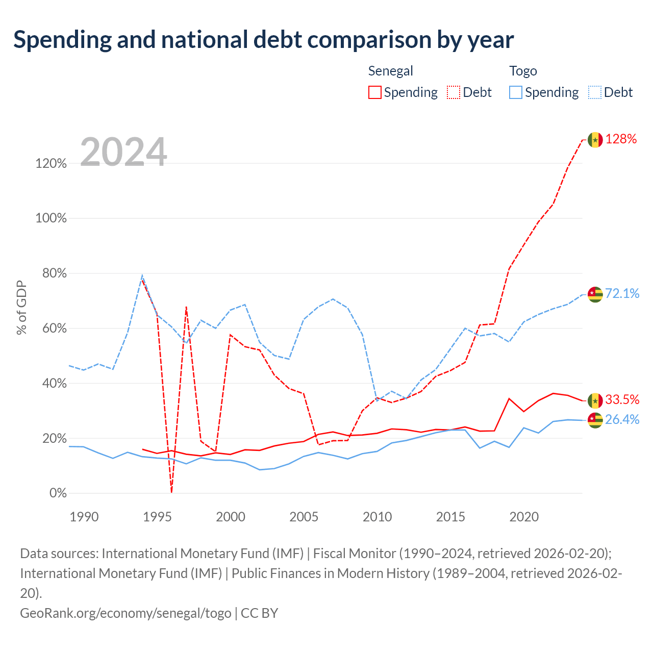 Senegal has $42.1B in government debt (128.4% of GDP), compared to $7.68B (72.1% of GDP) in Togo.