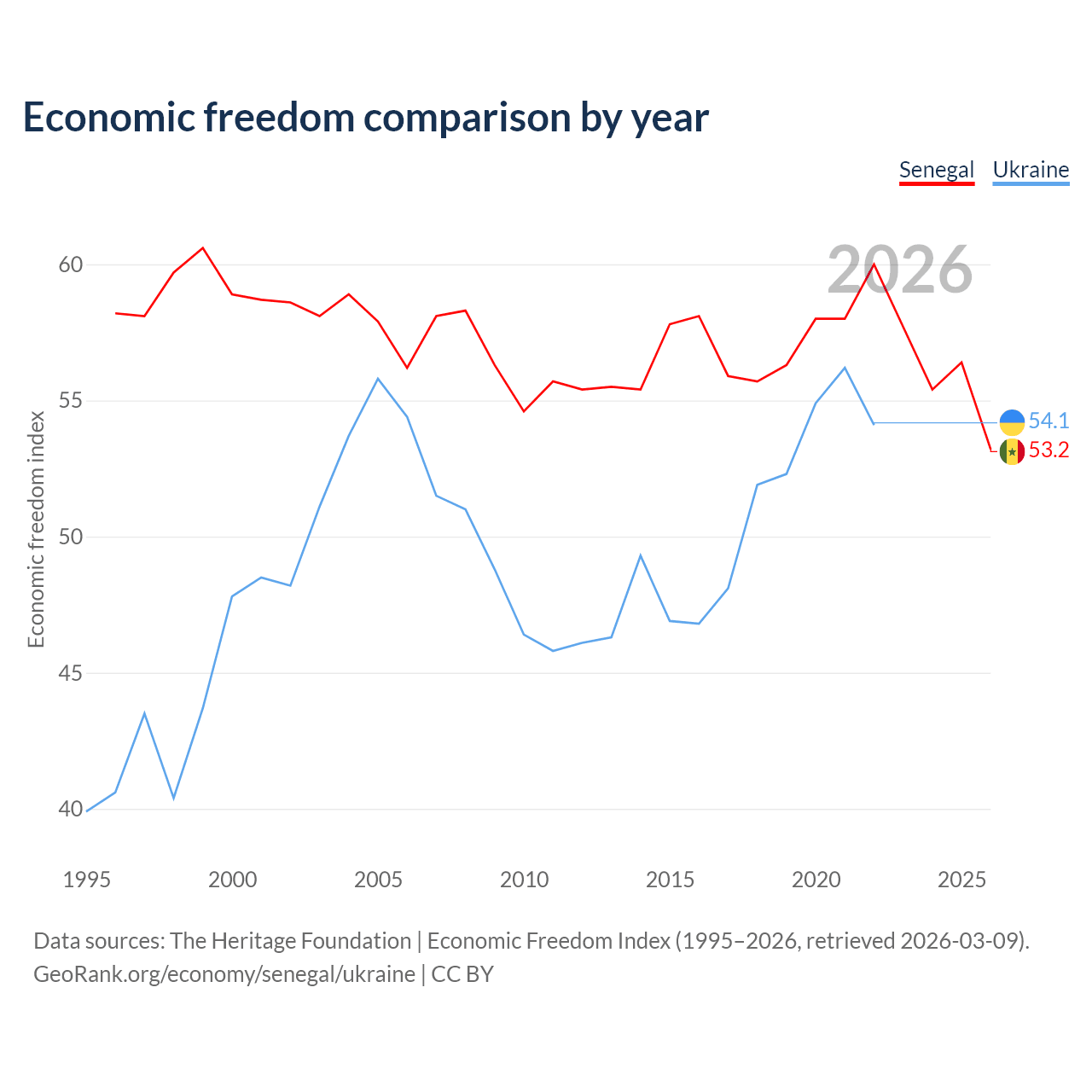 The Economic Freedom Index for Senegal is 53.2, ranking 140/197, compared to 54.1 for Ukraine, ranking 135/197. The chart above displays a comparison of annual changes in economic freedom indexes.