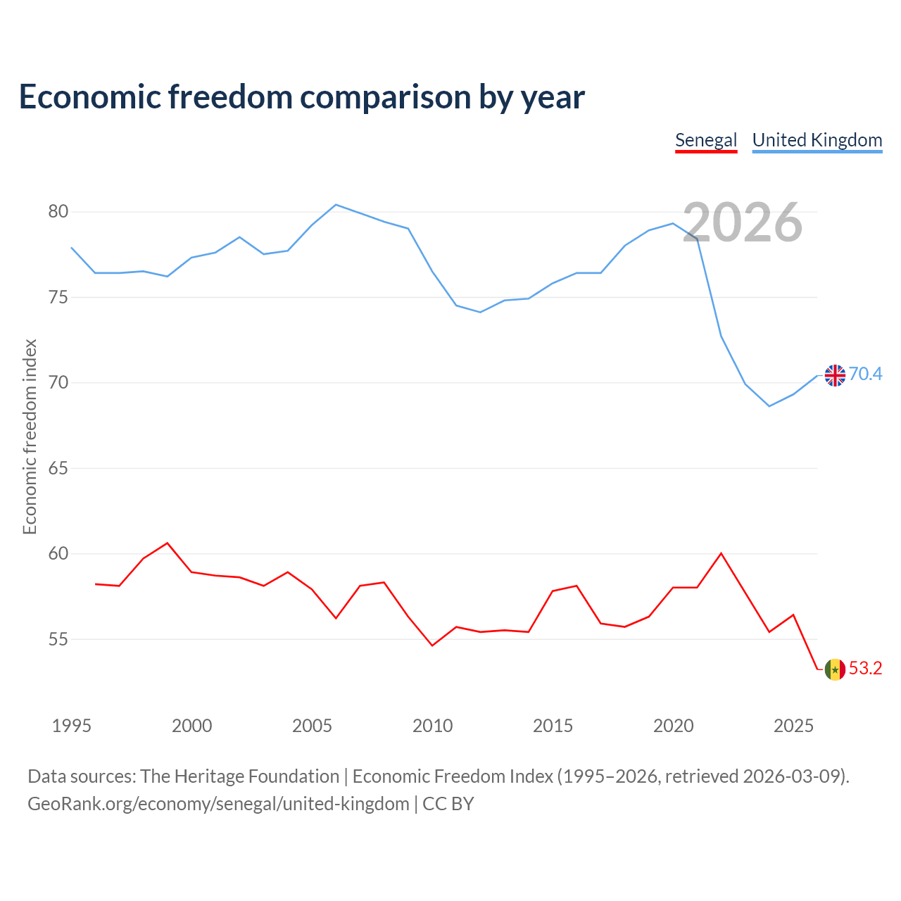 The Economic Freedom Index for Senegal is 53.2, ranking 140/197, compared to 70.4 for the United Kingdom, ranking 35/197. The chart above displays a comparison of annual changes in economic freedom indexes.